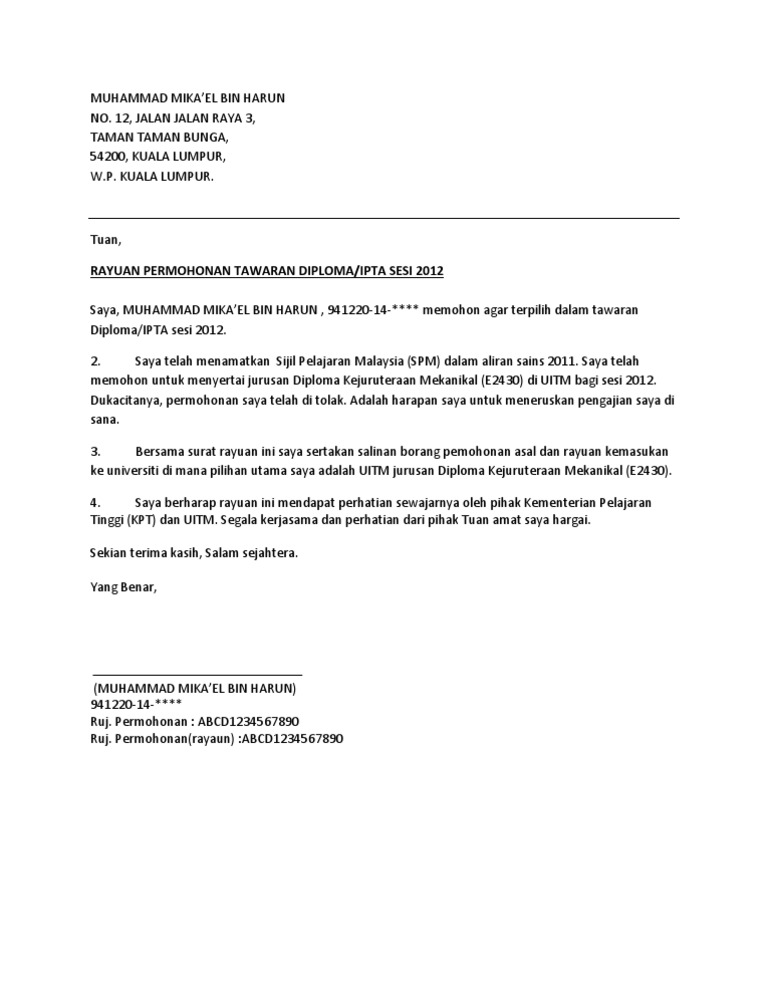 Surat rasmi rayuan kolej kediaman uitm urasmi pastikan anda membuat semakan semula borang permohonan anda di laman semakan bagi memastikan anda telah berjaya. Laman web ini tidak mempunyai sebarang kaitan dengan bahagian kemasukan pelajar ipta jabatan pengajian tinggi. Berikut dikongsikan Contoh Surat Rayuan Kemasukan Ke IPTA.